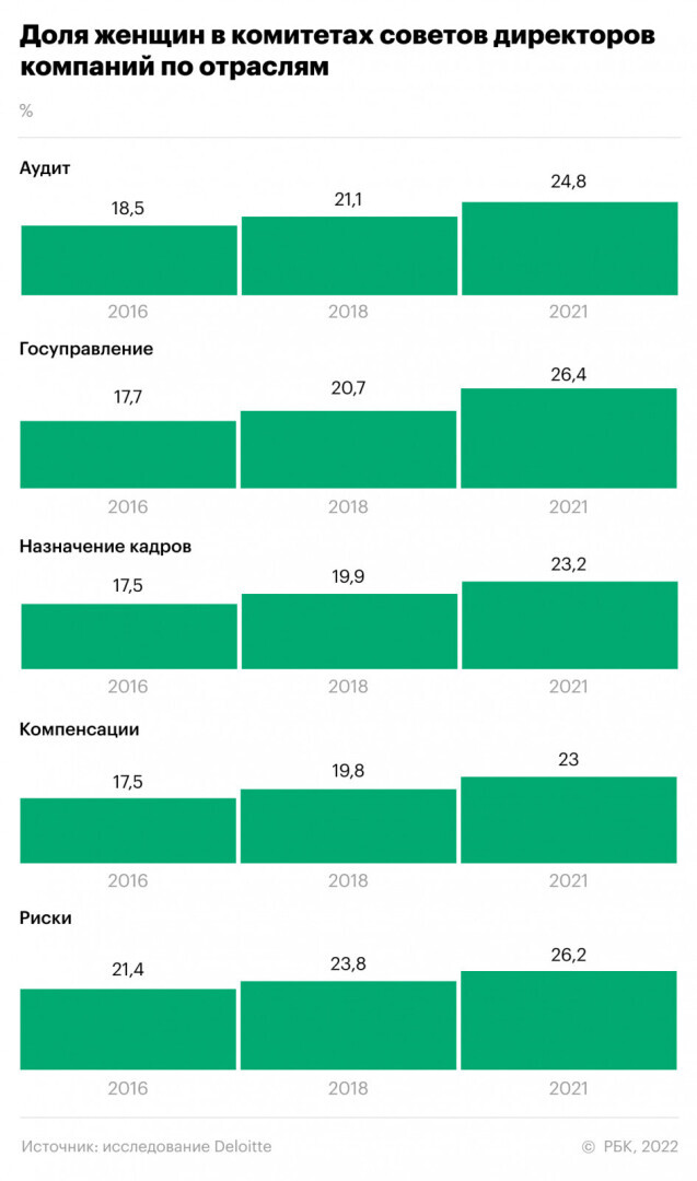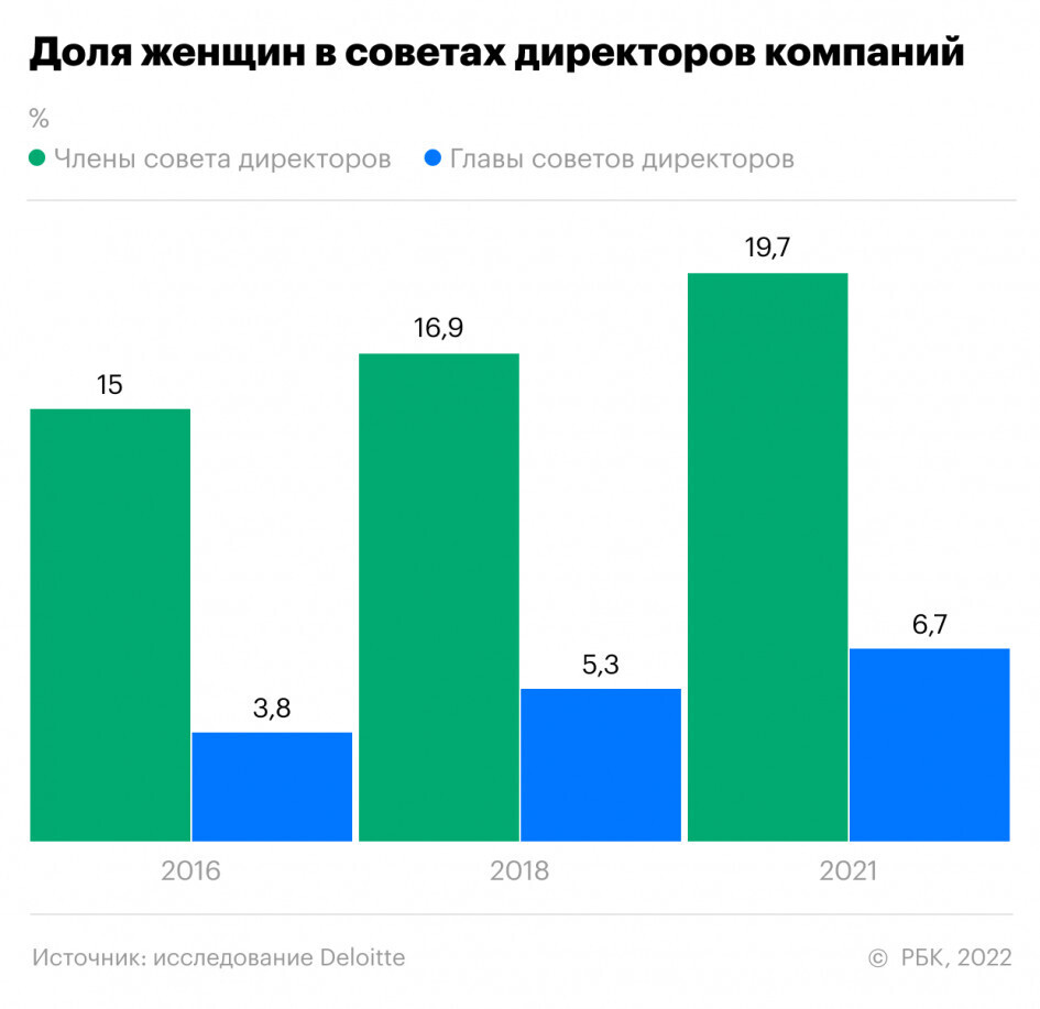 Всего 8,4% топ-менеджеров и членов советов директоров в российских компаниях, по данным на 2021 год, — женщины. Тем не менее этот показатель вырос по сравнению с 2018 годом, когда женщин на таких постах было 7,8%. Об этом говорится в исследовании международной консалтинговой компании Deloitte «Женщины в советах директоров: глобальная перспектива» (есть у РБК).