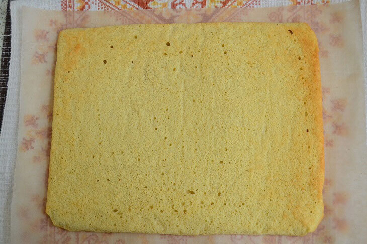 5. Готовый бисквитный корж переворачиваем на чистый лист пергамента, снимаем бумагу и даем немного остыть.