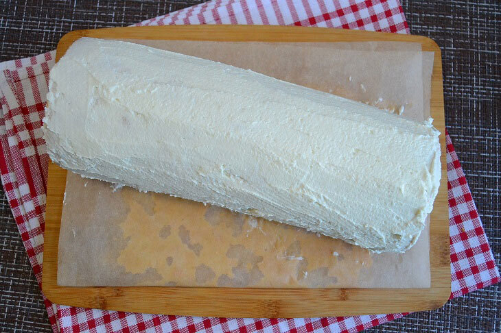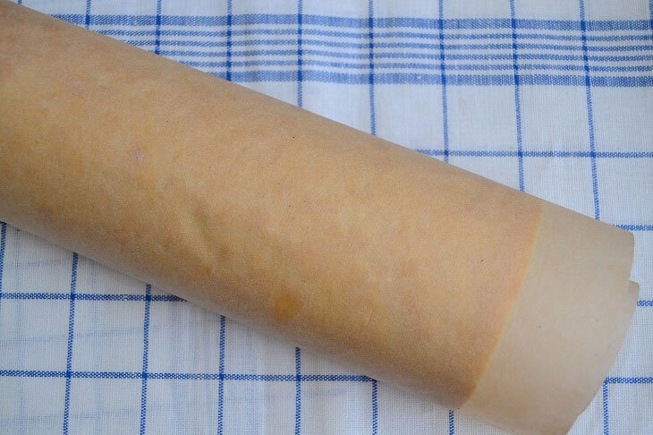6. Сворачиваем пласт бисквита вместе с пергаментом в плотный рулет и оставляем в таком виде полностью остыть на полотенце.