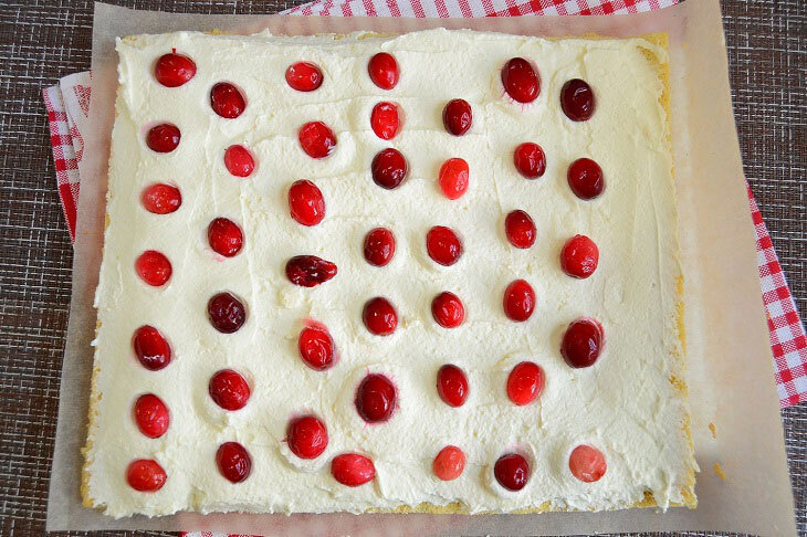 8. Бисквит освобождаем от пергамента, наносим крем по всей поверхности (часть оставляем для покрытия верха и боков рулета), раскладываем ягодки клюквы и сворачиваем бисквитный пласт аккуратно в рулет.