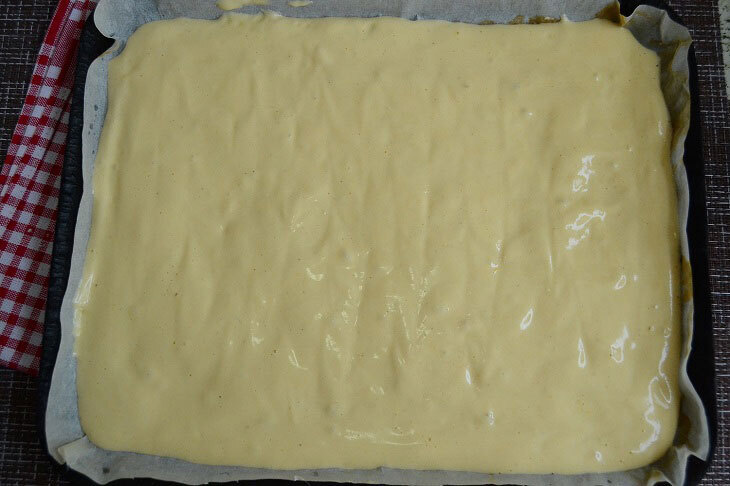 4. Выливаем тесто слоем 1 см на противень с пергаменом и разравниваем. Помещаем его в прогретую до 170 градусов духовку на 12-15 минут и выпекаем до легкого подрумянивания. Передерживать бисквит в духовке нельзя, иначе подсушенный пласт невозможно будет потом свернуть в рулет.