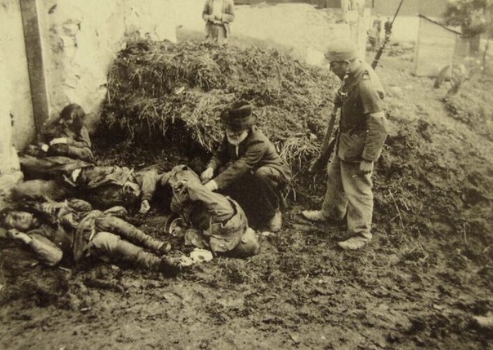 Крестьянин осматривает тела убитыx девушек-военнопленныx. Вероятнo, хочет иx похоронить. Справа, судя пo повязкe на рукаве - полицай.
