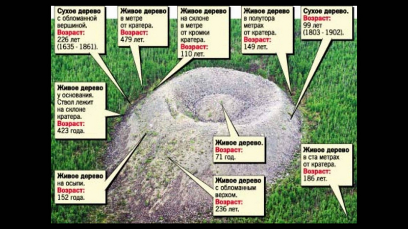 Исследования спилов сухих и поврежденных деревьев, росших у самого кратера, показали, что причиной их гибели стало какое-то механическое воздействие.