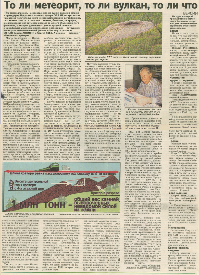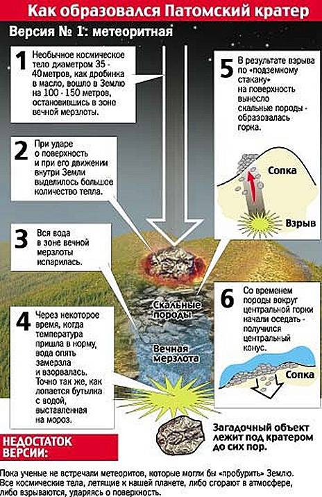 Во время экспедиции 1949 года геолог Вадим Колпаков обнаружил в Иркутской тайге странный объект, который охарактеризовал как усеченный конус с горизонтальным срезом. Внутри среза располагалось углубление, напоминающее воронку, с куполом внутри. Что собой представляет удивительное образование, названное Патомским кратером?