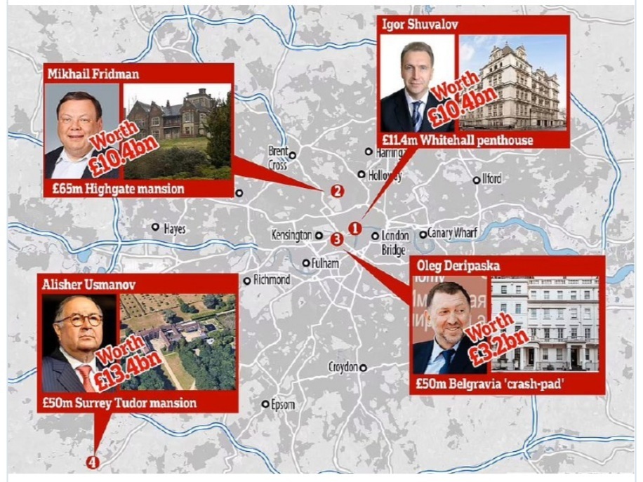 Британское издание The Daily Mail опубликовало «карту» недвижимости и финансовых активов российских олигархов в Великобритании. По информации издания, именно эти олигархи попадут под санкции, которые Великобритания хочет ввести против российского бизнеса.