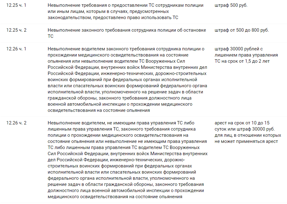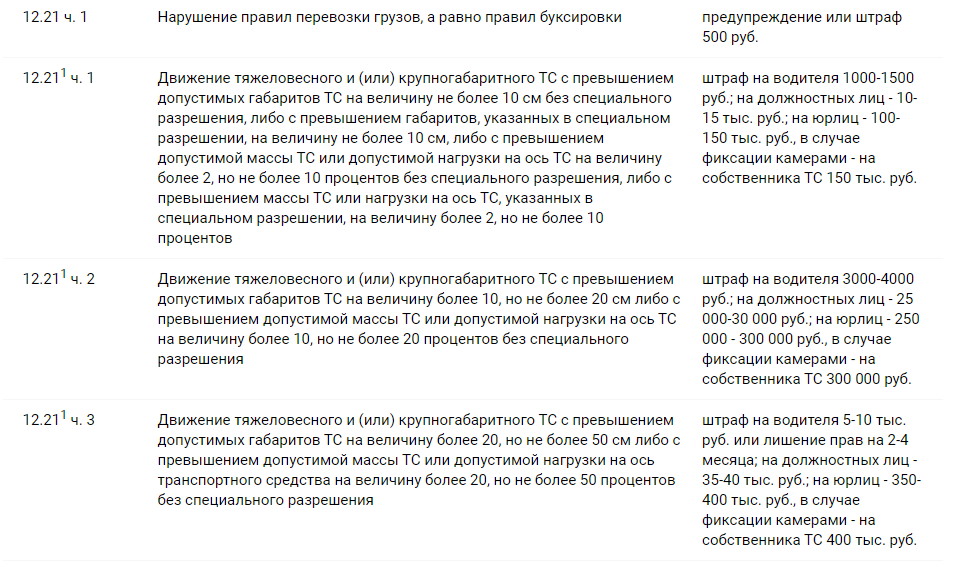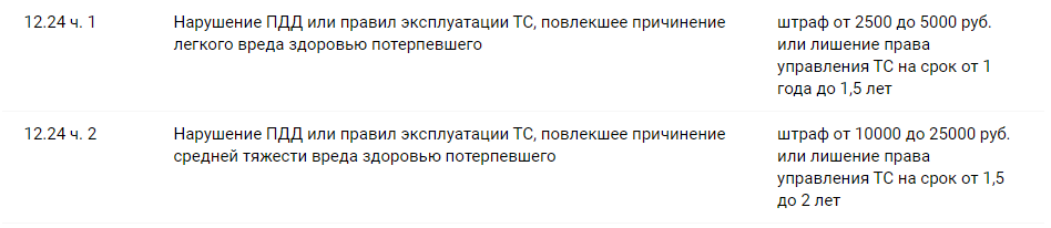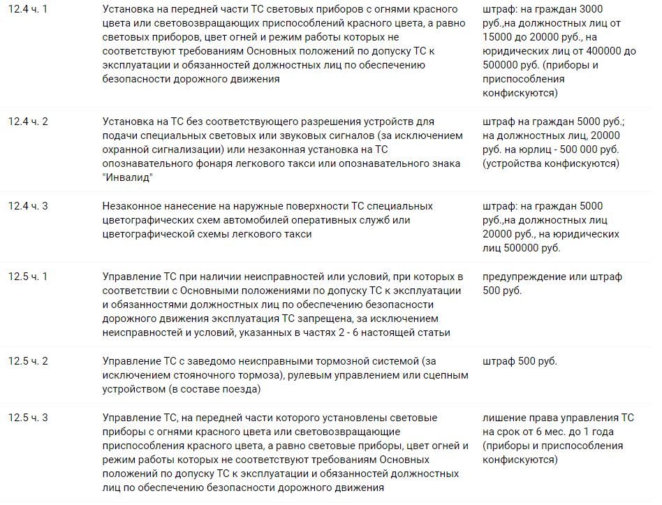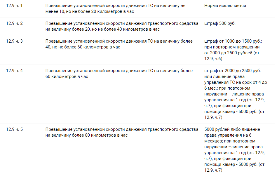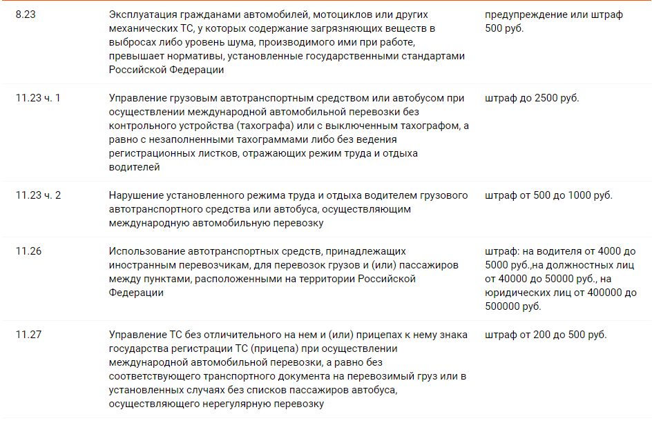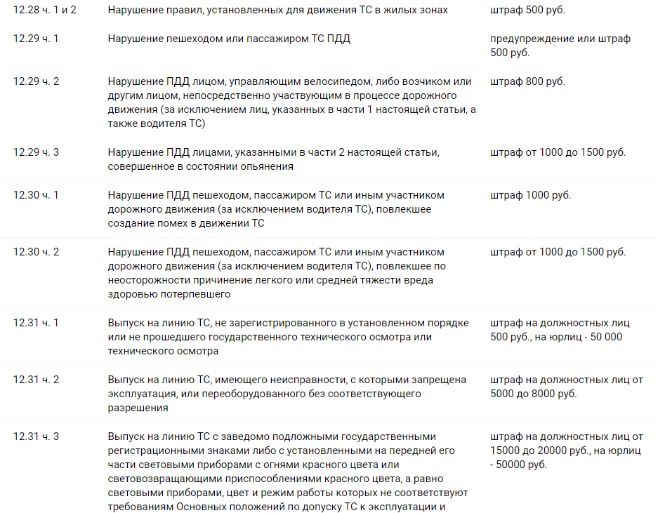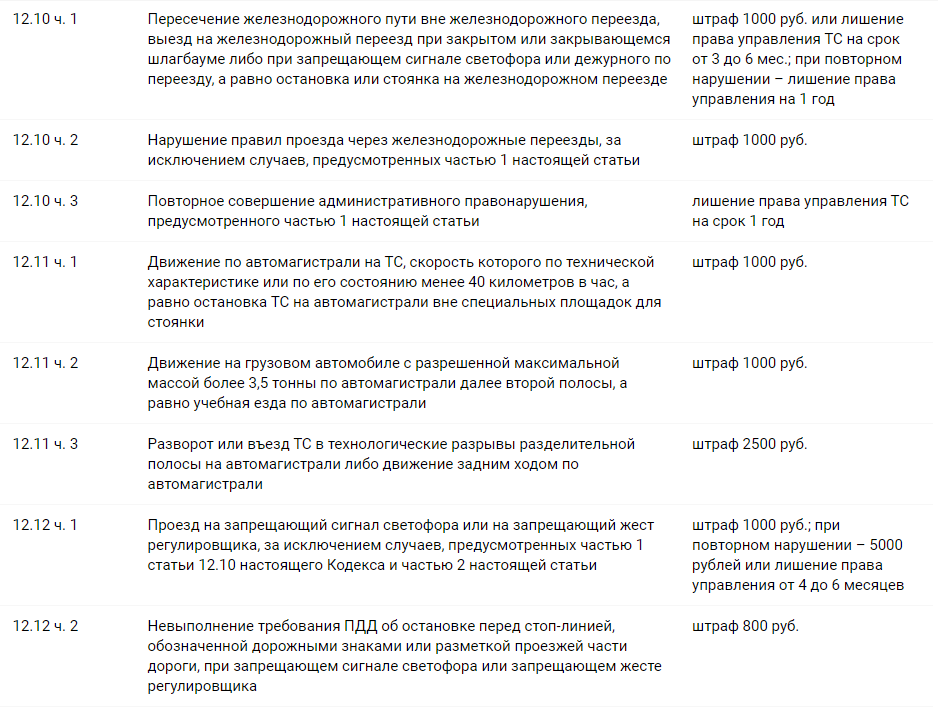 Таблица административных наказаний за совершение нарушений в области дорожного движения (таблица штрафов)