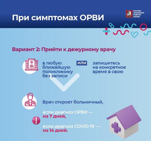 - Вариант 2: Прийти к дежурному врачу в любую ближайшую поликлинику без записи или записаться на конкретное время в свою. По итогам осмотра и обследований в случае установления диагноза ОРВИ врач откроет электронный больничный на 7 дней, при выявлении COVID - на 14.