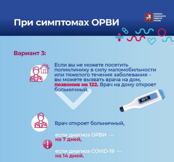- Вариант 3: Если вы не можете посетить поликлинику в силу маломобильности или тяжелого течения заболевания, можно вызвать врача на дом, позвонив по номеру 122. По итогу осмотра в случае установления диагноза ОРВИ врач откроет электронный больничный на 7 дней, при выявлении COVID - на 14.