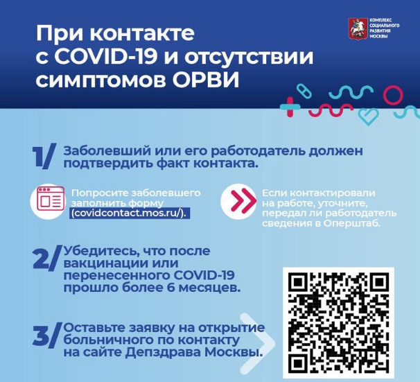 Оперштаб обращает внимание и случаи контакта с заболевшим COVID-19, даже если нет симптомов ОРВИ. Больничный откроют, если у заболевшего открыт больничный и факт контакта подтвердил его работодатель. Чтобы все сработало оперативно, лучше попросить заболевшего сообщить о контакте с вами, заполнив электронную форму.