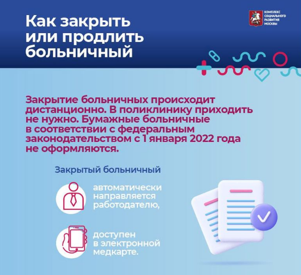 Закрытие больничных листов происходит дистанционно. В поликлинику приходить не нужно. Закрытый больничный автоматически направляется работодателю и доступен в электронной медкарте. Бумажные больничные в соответствии с федеральным законодательством с 1 января 2022 года не оформляются.