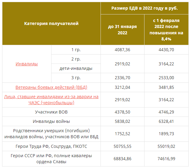 ЕДВ будет проиндексирована на 8,4% - это уровень инфляции в России по итогам 2021 года. Правда, сколько это будет в рублях, сказать сложно: для всех категорий ЕДВ рассчитывается по-разному. Основные категории, получателей ЕДВ и размер повышения представлены в таблице: