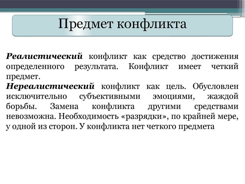 Предмет конфликта – это то, что стало объектом противоречащих друг другу или несовместимых притязаний сторон. Предметом конфликта может быть или конкретный объект (например, некий материальный предмет – один на нескольких желающих его получить), или некая возможность (одна должность, на которую претендуют несколько человек), или некое оценочное утверждение, оспариваемое другими, или соблюдение/несоблюдение каких-то правил и т. д. Предмет конфликта – это именно то, из-за чего вступают в противоборство, что становится объектом борьбы сторон. Предмет конфликта, как правило, связан с взаимоисключающими целями конфликтующих сторон (или, по меньшей мере, с целями одной из них).