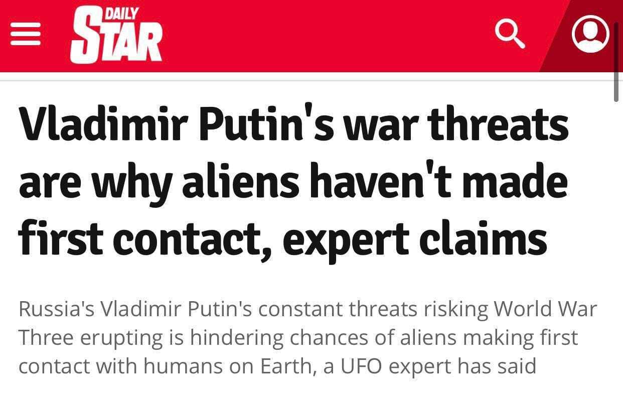 «Постоянные угрозы Владимира Путина, грозящего разразиться Третьей мировой войной, снижают шансы инопланетян на первый контакт с людьми на Земле, заявил эксперт по НЛО», - пишет желторотый Daily Star.