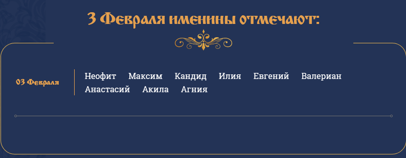 По церковному православному календарю 3 Февраля, отмечается всего 9 именины: 8 мужских и 1 женских. Список именин поможет в выборе имени для мальчика или девочки, рожденных в этот день.