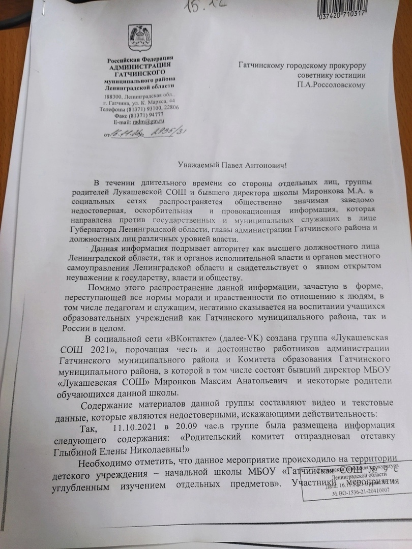 Увольнения директора им оказалось недостаточно и глава администрации Гатчинского района решила "добить" его доносом в прокуратуру. И не только Миронкова. Чиновницу возмутила группа школы в ВК, в которой общаются учителя из Лукашевской школы и родители учеников. По её мнению, там распространяется "заведомо недостоверная, оскорбительная и провокационная информация, которая направлена против государственных и муниципальных служащих" и, ни больше ни меньше: "переступает все нормы морали и нравственности".