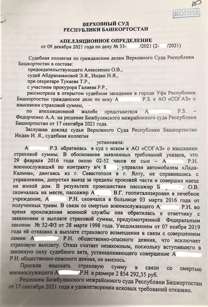 Для предоставления юридической помощи, ко мне обратилась мать военнослужащего, который погиб во время прохождения военной службы в дорожно-транспортном происшествии. Клиенту было отказано в страховой выплате в связи со смертью военнослужащего, поскольку им было совершено общественно опасное деяние.