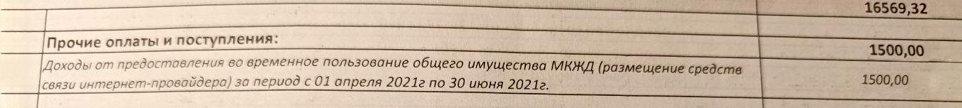 Это строка из квартального отчета УК: указаны все доходы от сдачи в аренду имущества моего дома. 1500 Р мы получали еще до того, как пришел оператор связи