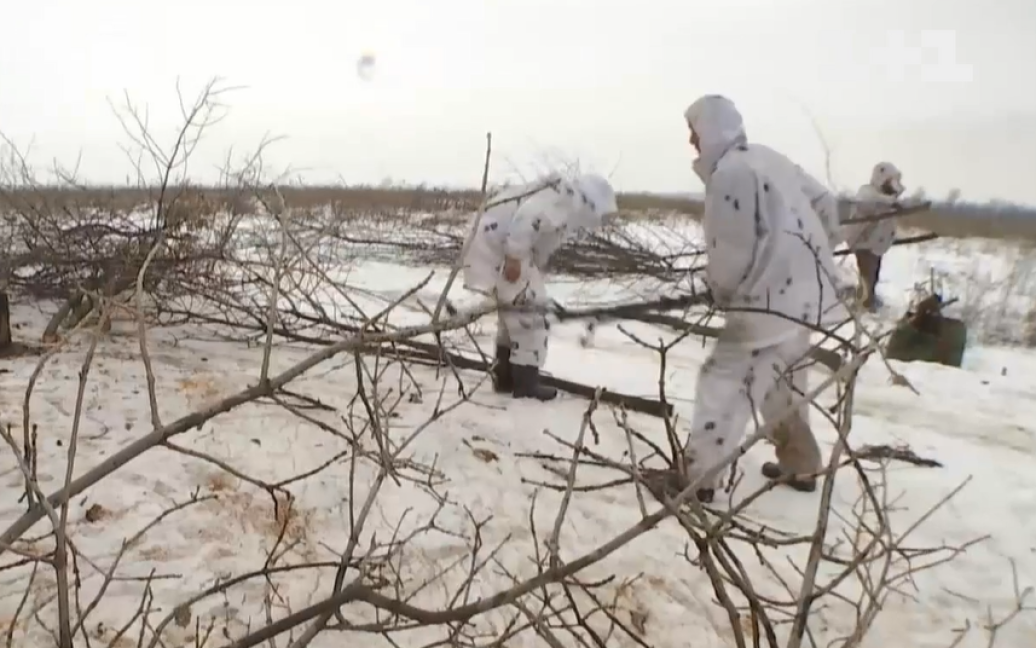 Бойцы сначала набрасывают ветки, потом хворост и затягивают это все маскировочной сеткой. Ребята рискуют, ведь к врагу сотни метров. Потому работают быстро, пока террористы не заметили.