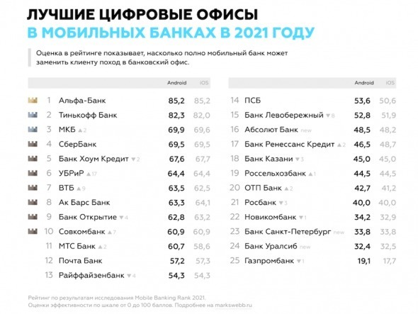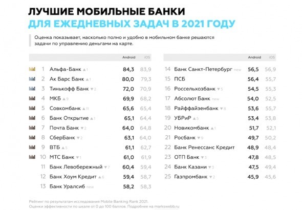 Markswebb в ноябре 2021 года оценил банковские приложения 25 российских банков для частных лиц. Это самые популярные банки, предлагающие клиентам полную линейку продуктов — карты, кредиты и вклады.