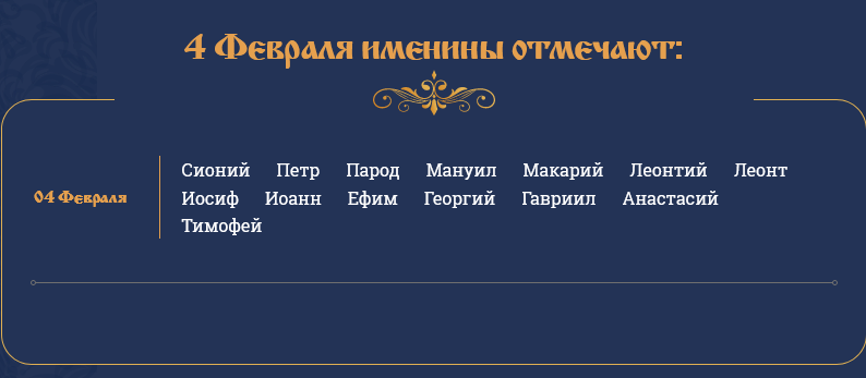 По церковному православному календарю 4 Февраля, отмечается всего 14 именины: 14 мужских и 0 женских. Список именин поможет в выборе имени для мальчика или девочки, рожденных в этот день.