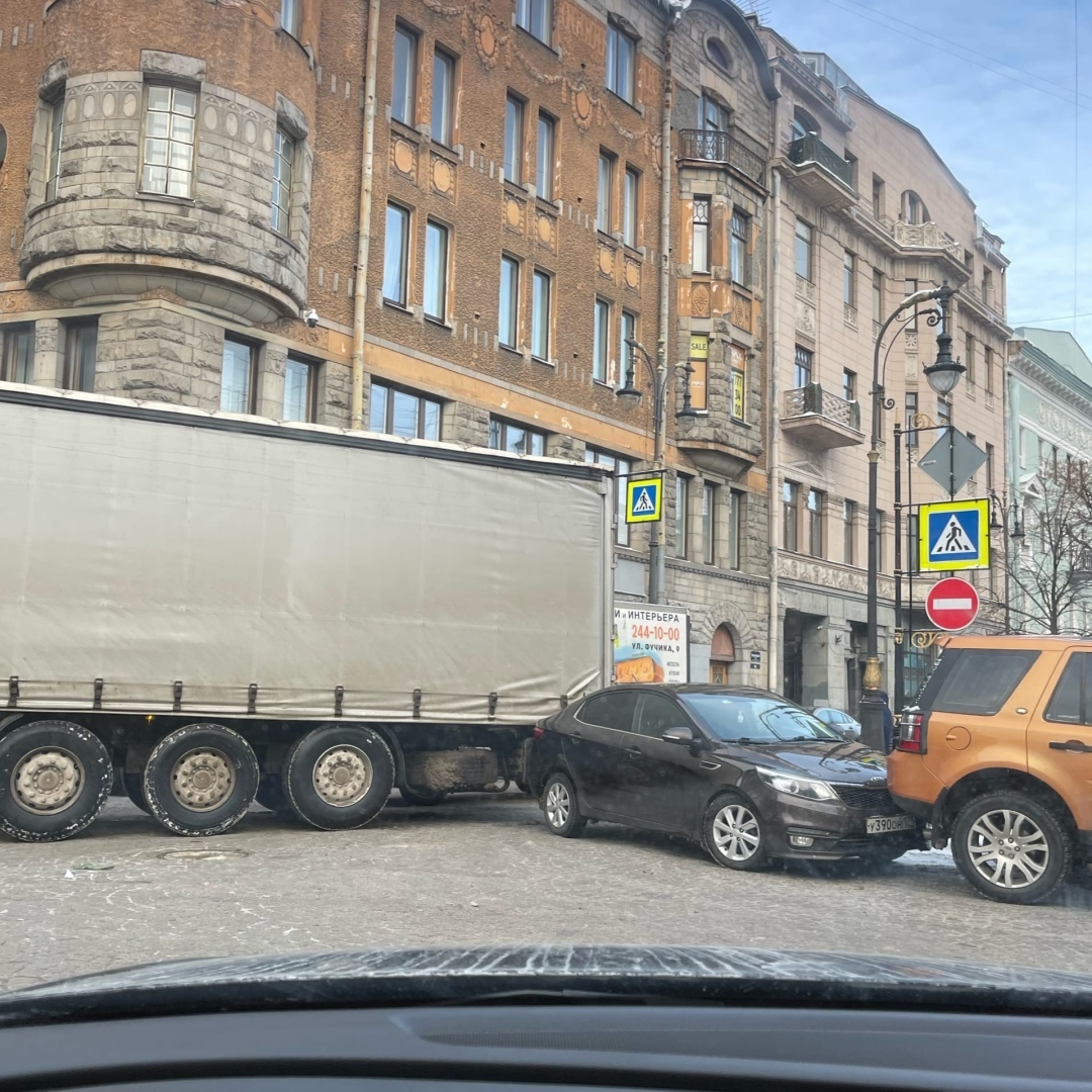 Из-за ДТП улица в сторону Невского проспекта встала намертво. Свое присутствие в центре города водитель большегруза объяснил проказами навигатора. «На вопрос ГИБДД, что он тут делает, водитель фуры сказал: его сюда завёл навигатор», — пишет очевидица.