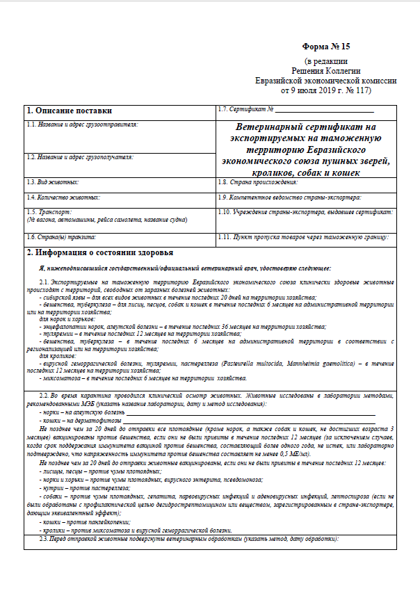 На официальном сайте Россельхознадзора (www.fsvps.ru) размещён образец ветеринарного сертификата для домашних питомцев, именуемый, как «Форма 15».
