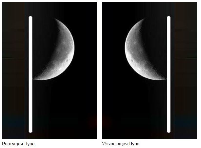 Фазу можно определить самостоятельно, взглянув на форму месяца. Мысленно провести прямую вертикальную линию, если получилась буква «Р» — Луна растет, если «У» — то убывающая.