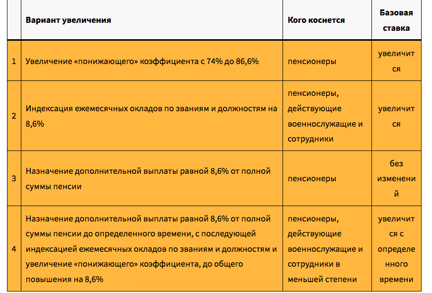 На просторах социальных сетей и новостных каналов появились сомнительные проекты документов. Официально они никем не подтверждены и возможно являются фейком. Но их содержание очень подходит под вариант под пунктом 4 ранее построенной таблицы. Назначение дополнительной выплаты равной 8,6% от полной суммы пенсии до определенного времени, с последующей индексаций ежемесячных окладов по званиям и должностям и увеличением «понижающего» коэффициента, до общего повышения пенсии на 8,6%.
