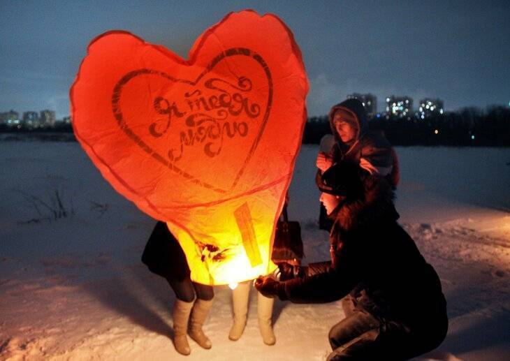У влюбленных пар в праздничный день 14 февраля принято под запуск горящих фонариков в форме сердечка, загадать желание. Высоко улетел фонарик – к счастью и к добру.