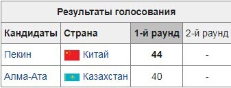 В конечном итоге Пекин победил Алма-Ату с перевесом всего в четыре голоса. Китайская столица стала первым городом, где проходили летние и пройдут зимние Игры.