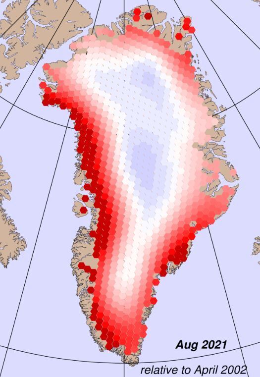 Согласно новым спутниковым данным, собранным компанией Polar Portal, объединяющей четыре датских государственных исследовательских института, за последние 20 лет Гренландия потеряла более 5 100 миллиардов тонн (4 700 миллиардов метрических тонн) льда, что примерно достаточно для затопления всей территории США водой на глубину 0,5 метра.