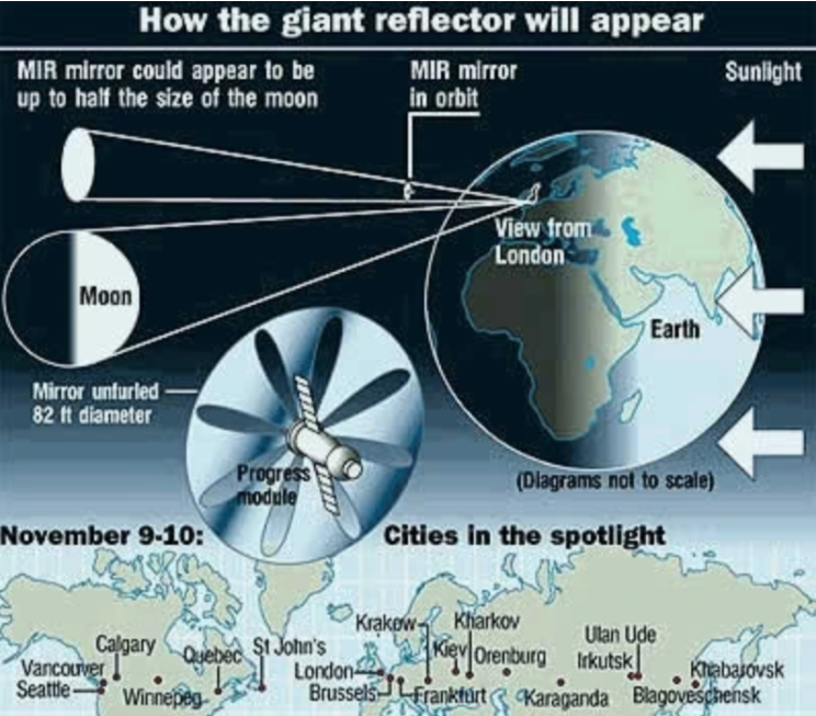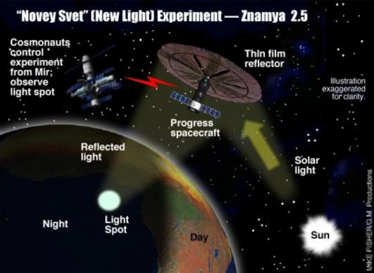 4 февраля 1993 году Россия успешно развернула собственный прототип спутника освещения «Знамя», около 20-метровой отражающей пленки, которая разворачивалась в космосе. В течение нескольких часов он вращался вокруг пары сотен метров над Землей, излучая прожектор шириной 5 км. Но свет двигался только со скоростью около 8 км / час, и в результате большинство людей видели вспышку в небе, когда она проходила. В конце концов, он упал с орбиты и сгорел при входе в атмосферу.