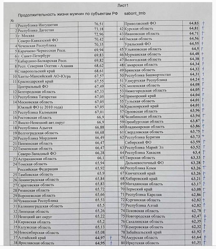 Между тем, существует таблица продолжительности жизни мужчин по регионам страны. Вот она: