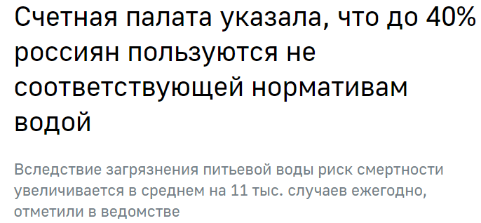 Питьевая вода загрязнена до некуда, воздух тоже, а продолжительность жизни растет? Да ладно!!! Статистика врет как всегда. Сходите на кладбища, убедитесь сами. Сплошь могилы 40-50 летних, у нас по крайней мере, в городе, где нет ни одного толкового промышленного предприятия.