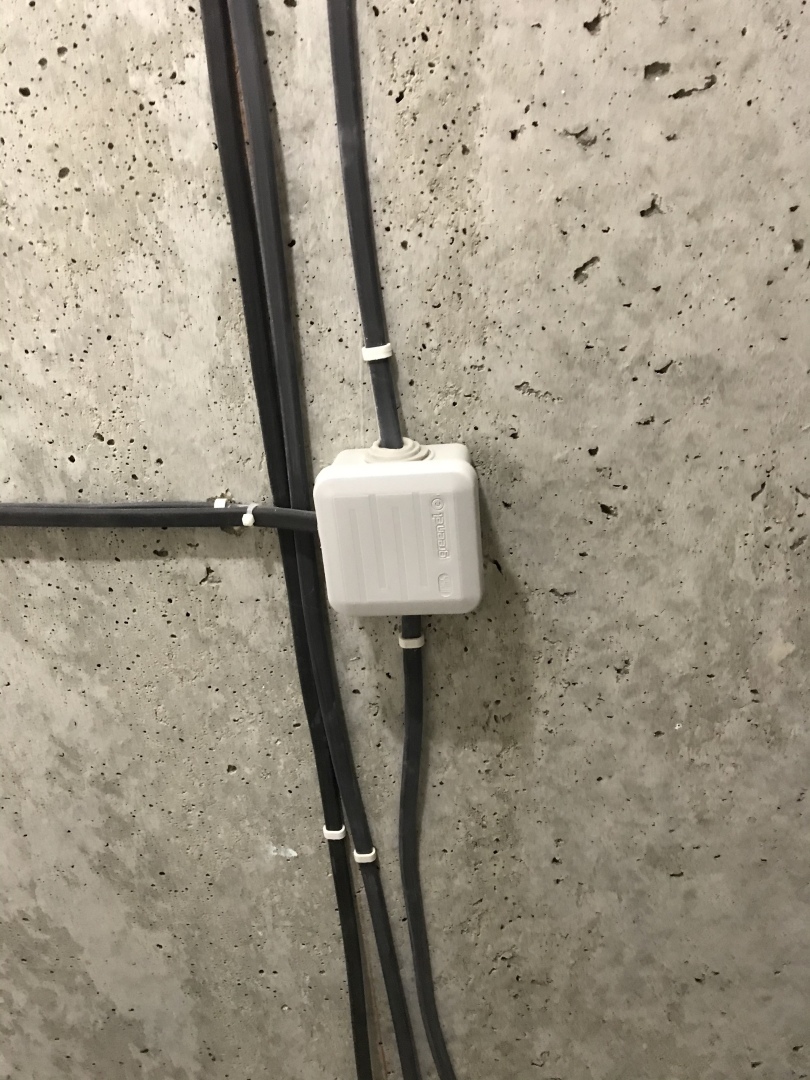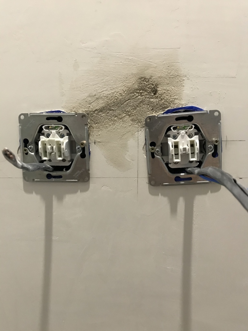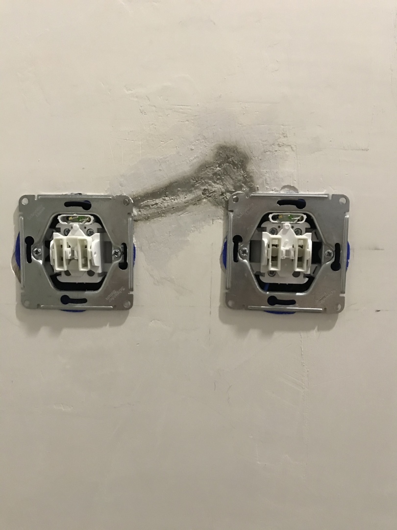 Пока отсутствовал выбрал коронкой по бетону отверстия под выключатели, проштробил канавки под провода, провода я «прокинул» заранее ещё до того как начал штукатурить, установил пластиковые «стаканы» под выключатели, замазал «штробы», примерял выключатели, пока штукатурка твердеет пишу Вам,