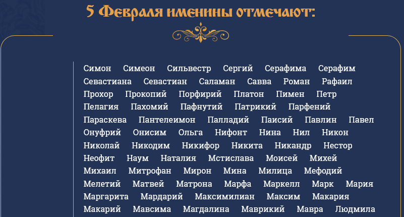 По церковному православному календарю 5 Февраля, отмечается всего 239 именины: 188 мужских и 51 женских. Список именин поможет в выборе имени для мальчика или девочки, рожденных в этот день.