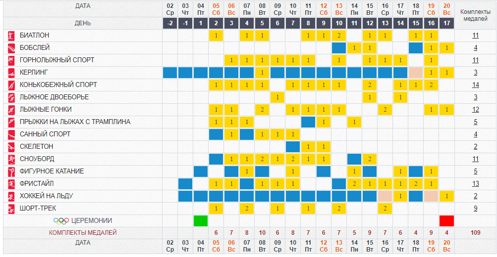 2. Будет разыграно 109 комплектов медалей — на семь больше, чем на XXIII Олимпийских зимних играх 2018 года в Пхенчхане. Новые дисциплины включены в программу соревнований по бобслею, шорт-треку, фристайлу, прыжкам на лыжах с трамплина и сноуборду.