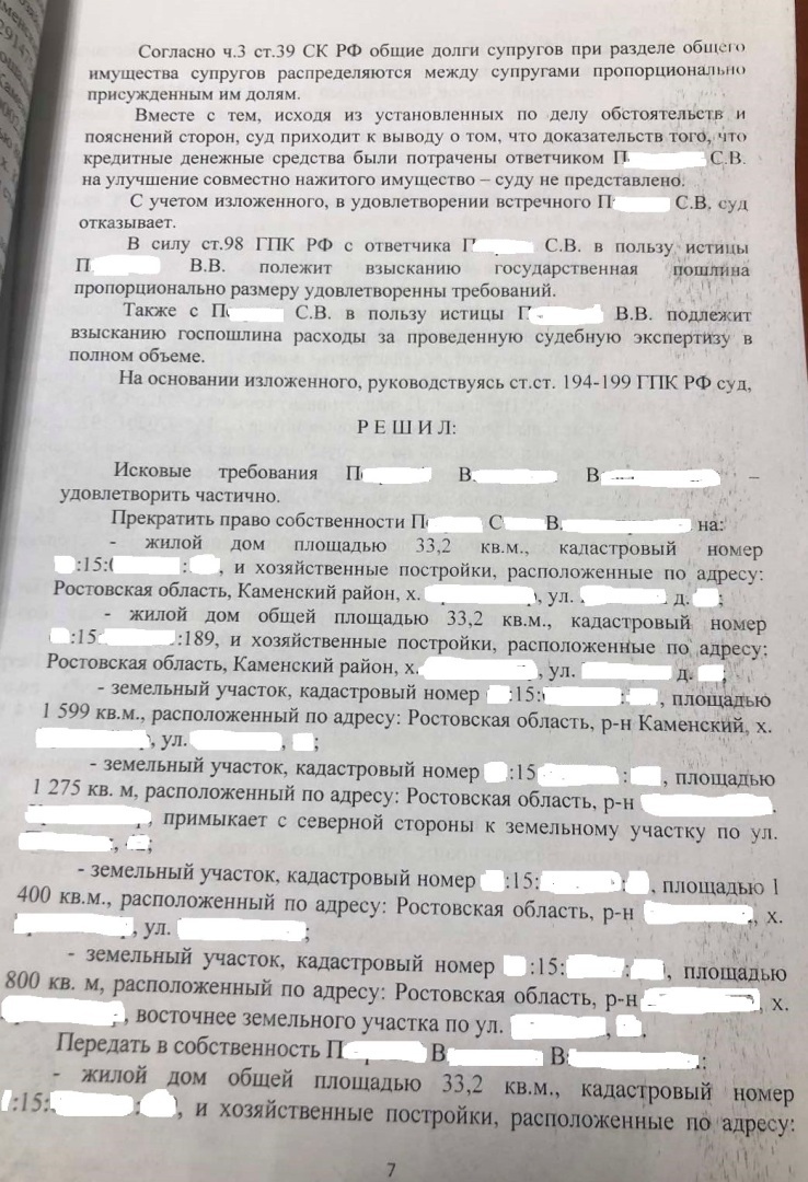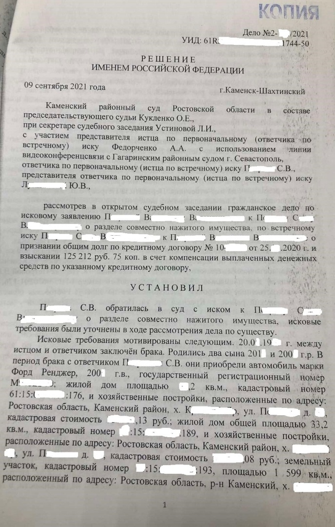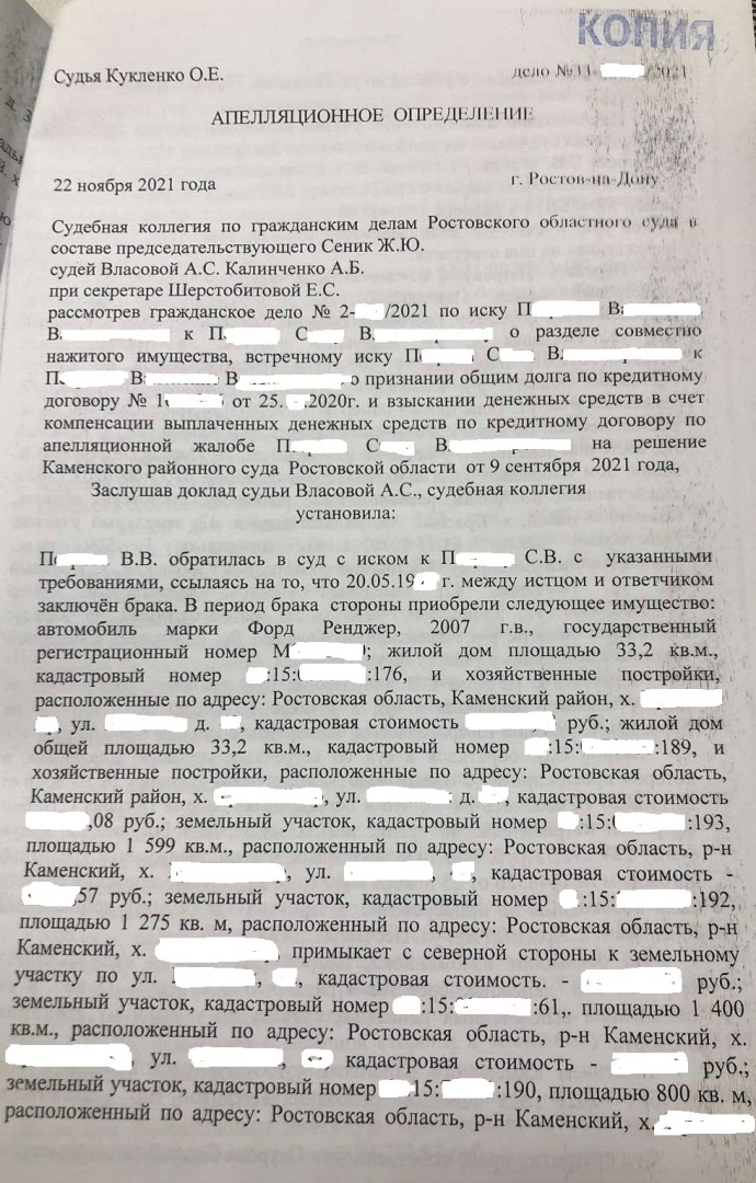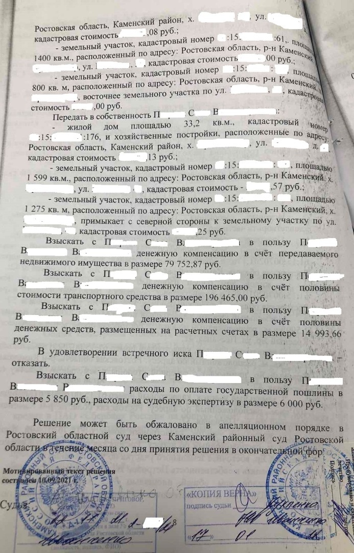 Решением Каменского районного суда Ростовской области от 09.09.2021 г., оставленного без изменений апелляционным определением Ростовского областного суда от 22.12.2021 г., исковое заявление клиента к бывшему супругу о разделе совместно нажитого в браке имущества удовлетворено частично, встречное исковое заявление бывшего супруга клиента о разделе кредитных обязательств оставлено без удовлетворения. Передано в собственность клиента два земельных участка, жилой дом, взыскана компенсация половины стоимости автомобиля и денежных средств, находящихся на банковских счетах бывшего супруга.