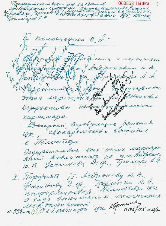 Это решение было принято в обстановке строгой секретности. Текст был написан вручную секретарь ЦК КПСС К. У. Черненко фото будет прикреплено к статье.