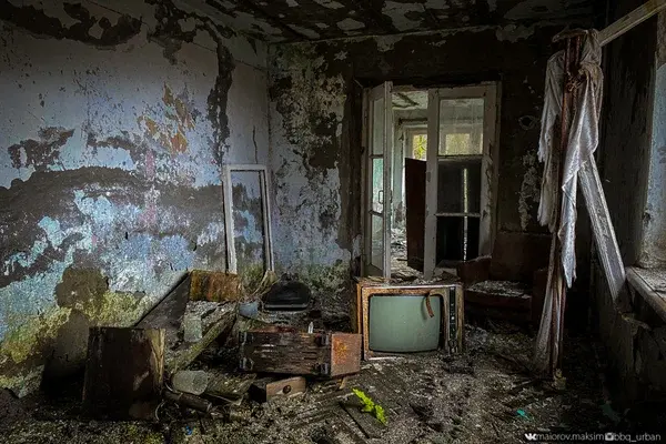 Заходим в один из заброшенных домов и поднимаемся на второй этаж. Становится немного жутко от местных пейзажей. Повсюду разбросаны вещи бывших жильцов, которые почти 30 лет назад покинули свои квартиры. Грабить здесь, по сути, некому, а все самое ценное и нужное в быту - давно забрали местные, оставив старые вещи просто лежать и гнить в квартирах.