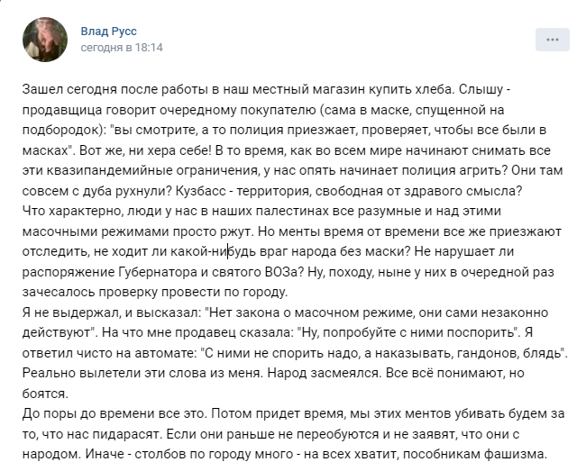 Зашел сегодня после работы в наш местный магазин купить хлеба. Слышу - продавщица говорит очередному покупателю (сама в маске, спущенной на подбородок): "вы смотрите, а то полиция приезжает, проверяет, чтобы все были в масках". Вот же, ни хера себе! В то время, как во всем мире начинают снимать все эти квазипандемийные ограничения, у нас опять начинает полиция агрить? Они там совсем с дуба рухнули? Кузбасс - территория, свободная от здравого смысла?