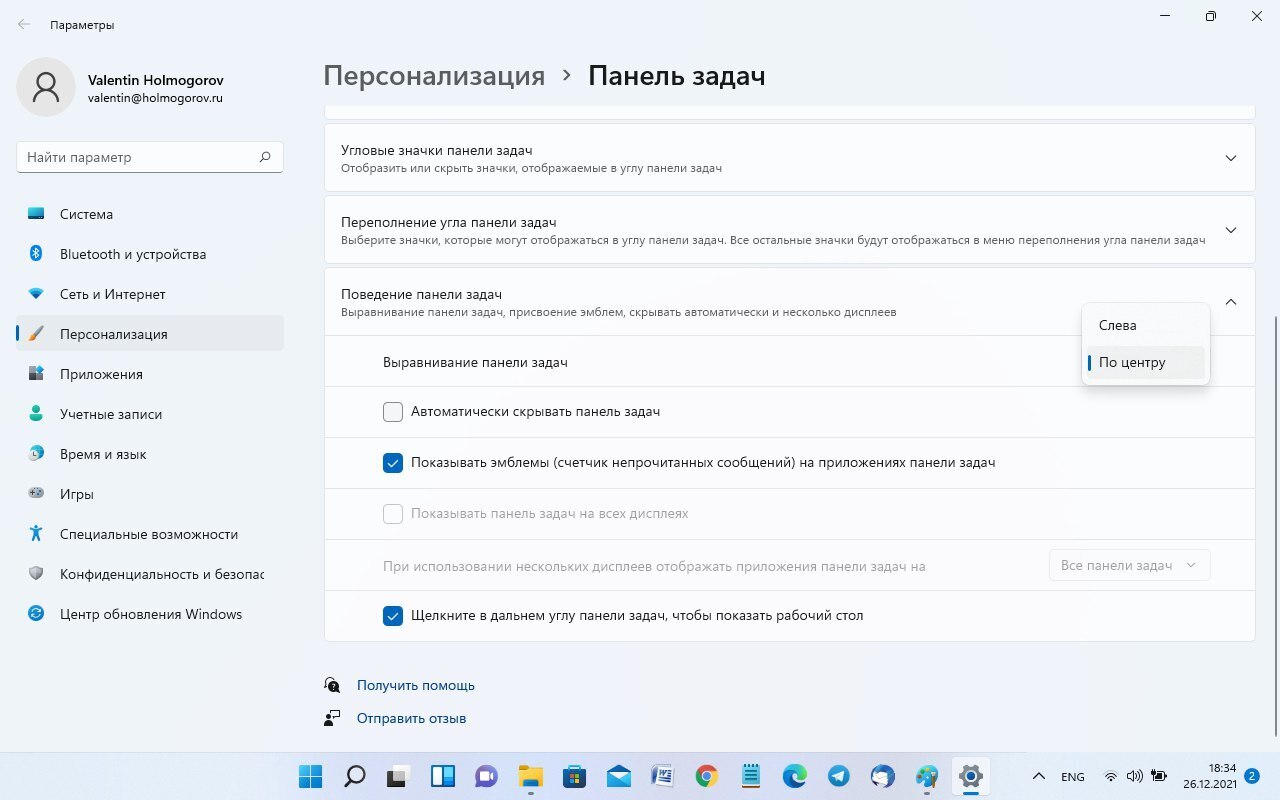 Новая панель задач в стиле macOS пришлась по вкусу многим пользователям Windows, но далеко не всем. Можно переместить значки приложений и кнопку «Пуск» в левую часть панели задач, как это было реализовано в «десятке». Для этого щелкни правой клавишей мыши в любой свободной от значков точке панели и в открывшемся контекстном меню выбери пункт «Параметры панели задач». В открывшемся окне разверни список «Поведение панели задач» и в расположенном справа меню выбери пункт «Слева».