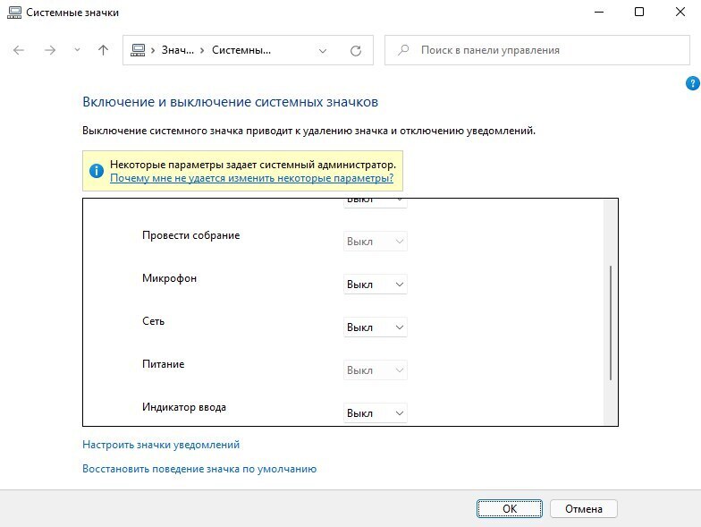 Откроется окно «Системные значки», с помощью которого можно настроить отображение значков в панели задач.