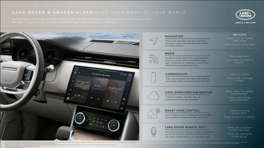 Alexa в Jaguar и Land Rovers будет пригодна для использования без необходимости смартфона и сможет помогать водителям громкой связи с воспроизведением музыки, навигацией по различным достопримечательностям и всем остальным, на что способна Alexa, например, объявлять новости и погоду. Вы также можете включить климат и заблокировать / разблокировать автомобиль, используя новые дистанционные навыки с Alexa из вашего дома.