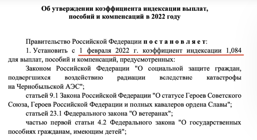 В Постановлении Правительства РФ перечислены все виды пособий, который проиндексируют с 1 февраля 2022 года. Индексация коснется, например, некоторых выплат на детей (детских пособий), материнского капитала и пособия на погребение. Также будет индексация ЕДВ.