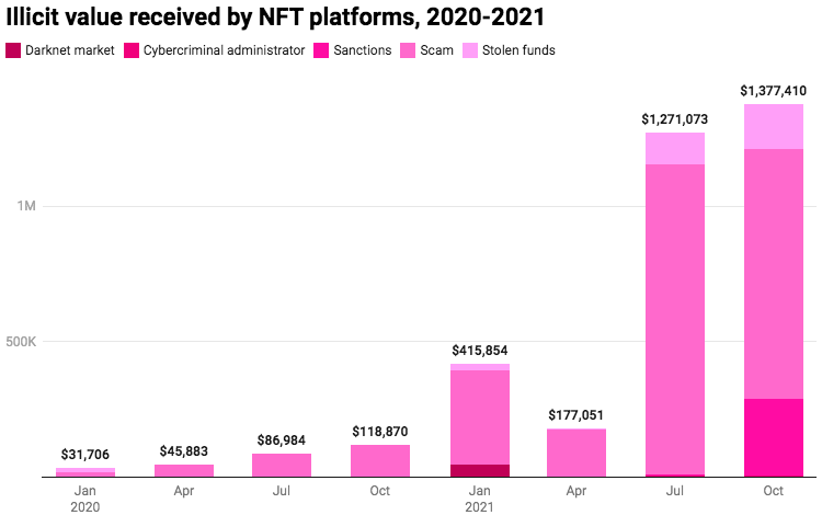Исследователи определили минимальную сумму отмытых денег путём отслеживания транзакций, направленных на торговые площадки NFT с криптовалютных кошельков, которые ранее были замечены в связях с мошенничеством, вредоносным ПО и другими видами незаконной деятельности. Общая сумма составила около $1,4 миллиона в четвёртом квартале 2021 года — это может показаться небольшой суммой, но она более чем в три раза выше показателя первого квартала — $415,8 тысяч.