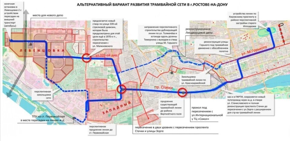 В ПКРТИ предложены базовый и два альтернативных варианта развития трамвайной сети. Трасса базового почти повторяет маршрут 71-го автобуса: Левенцовка — Еременко — Зорге — Стачки — Центральный рынок. На рынке новая линия соединяется со старыми рельсами в центре города. Первый альтернативный вариант из того же документа — по Зорге, но с поворотом не на Стачки, а на Толмачева, и дальше вдоль русла Темерника до Привокзальной площади. Другая опция — по Стачки с выходом на Западную хорду.