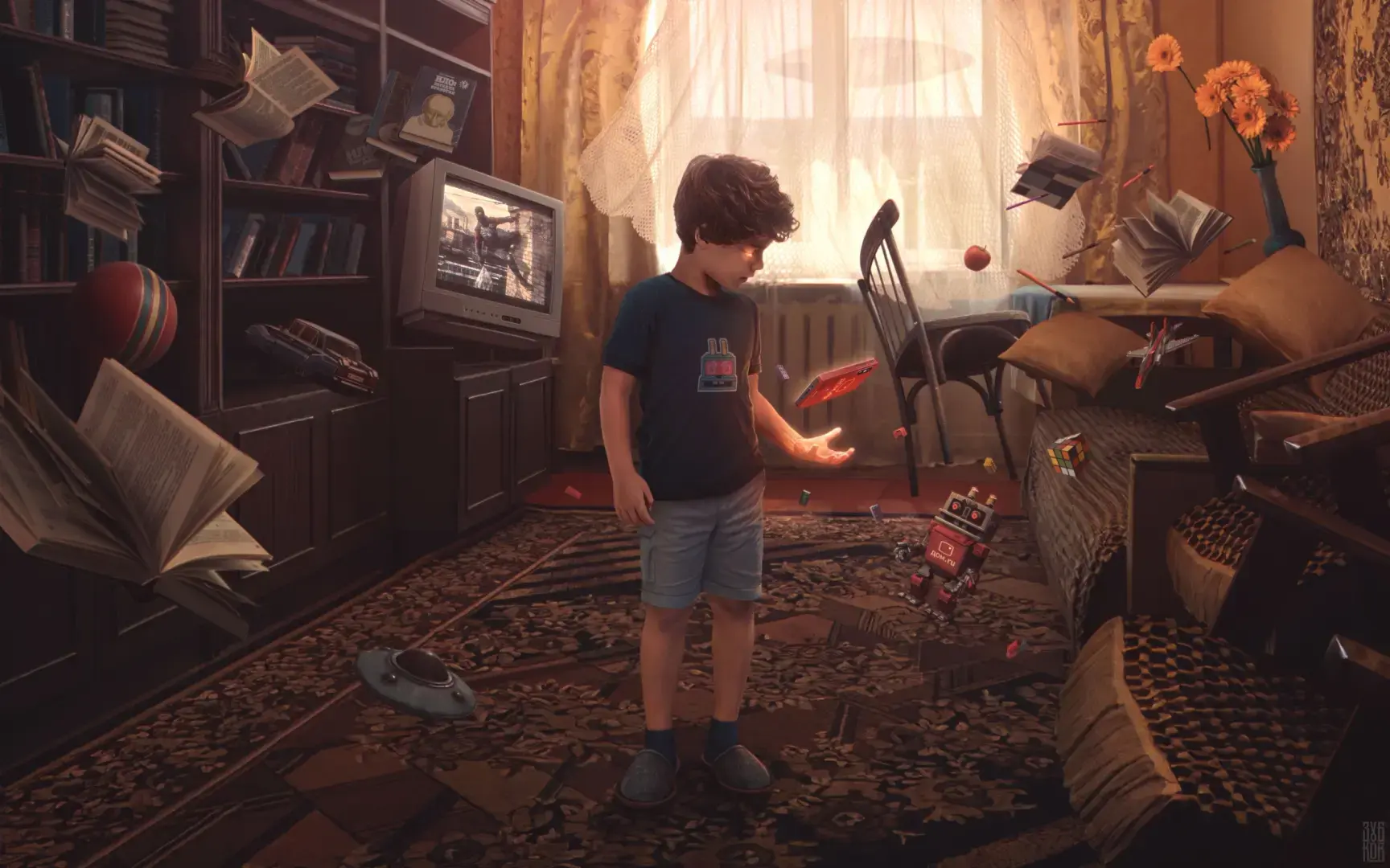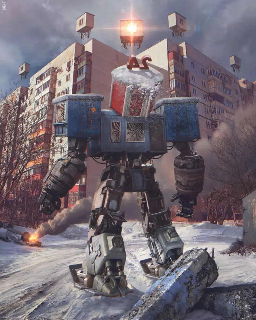 В работах автора андроиды, космические корабли, летающие машины и узнаваемые с первого взгляда персонажи поп-культуры приходят на улицы российских городов. Осторожно: граница между реальностью и фантастическим будущим стирается полностью. Так и хочется выглянуть в окно и перепроверить, не сражается ли там Северный Паук с Жестянщиком.