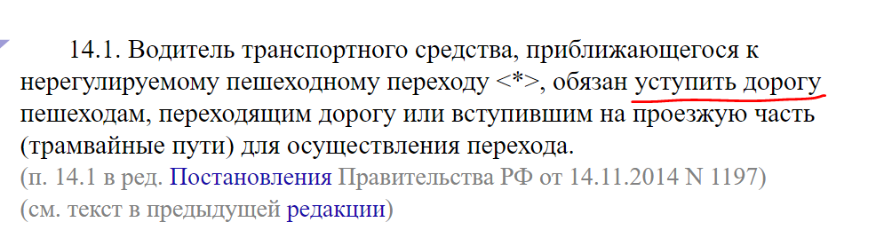 В частности в Московском суде при вынесении решения руководствовались правилами, действовавшими до 2014-го года, и предусматривающими необходимость изменения скорости движения авто или направления движения при предоставлении преимущества пешеходу. При этом использовались обобщенные понятия о пропуске человека за счет полной остановки или снижения скорости движения транспортного средства.