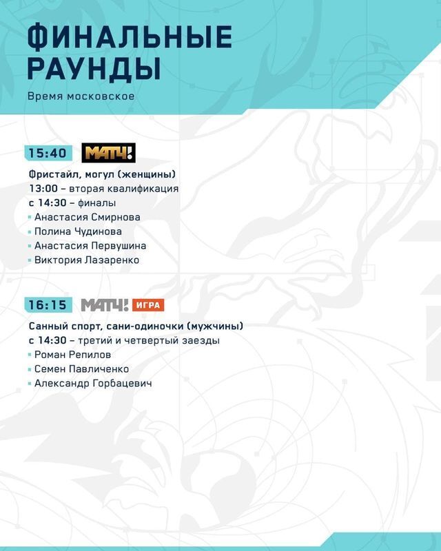 15:40. «Матч ТВ». Фристайл, могул (женщины). С 13:00 — вторая квалификация. С 14:30 — финалы. Анастасия Смирнова, Полина Чудинова, Анастасия Первушина, Виктория Лазаренко.
